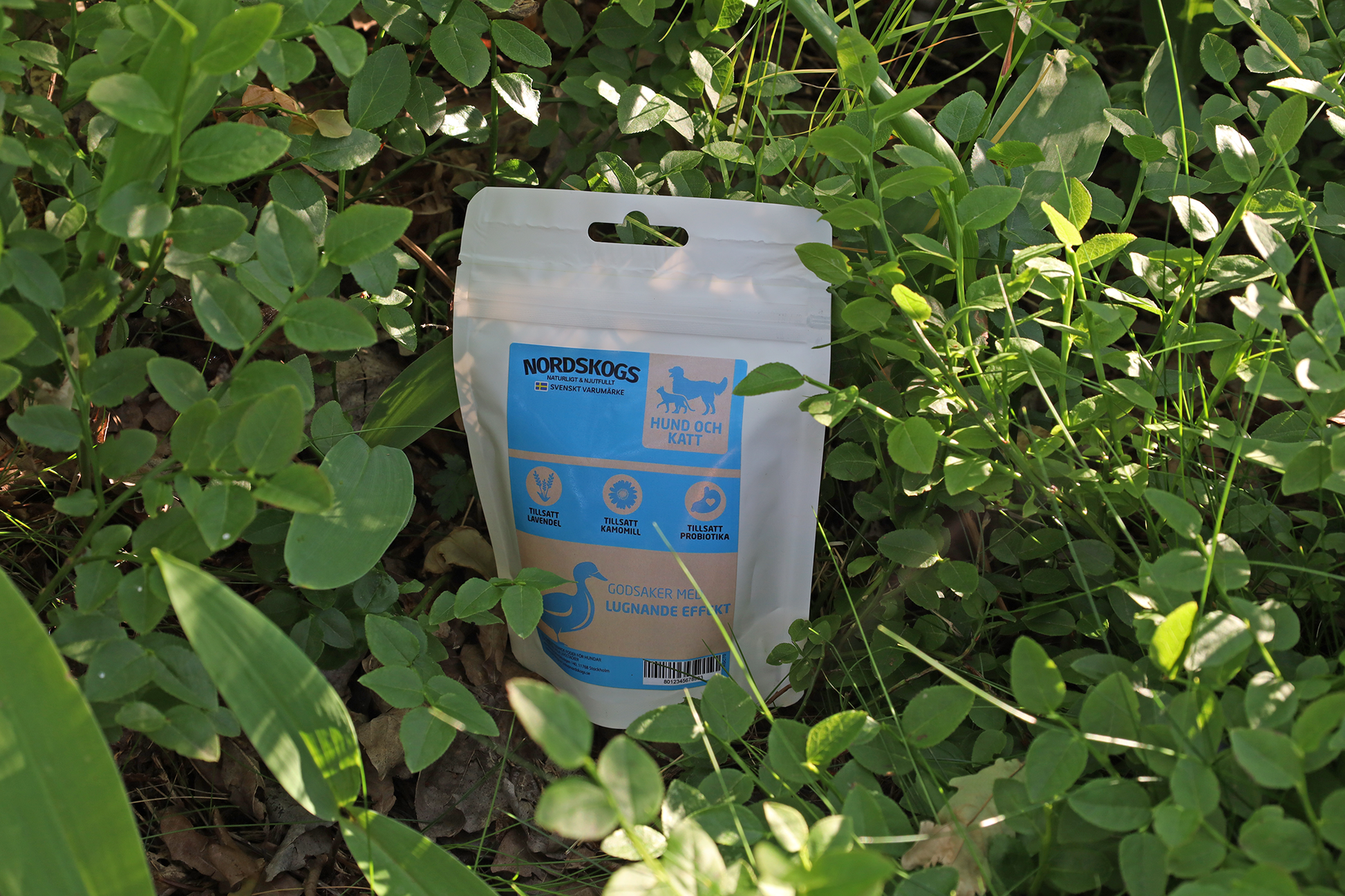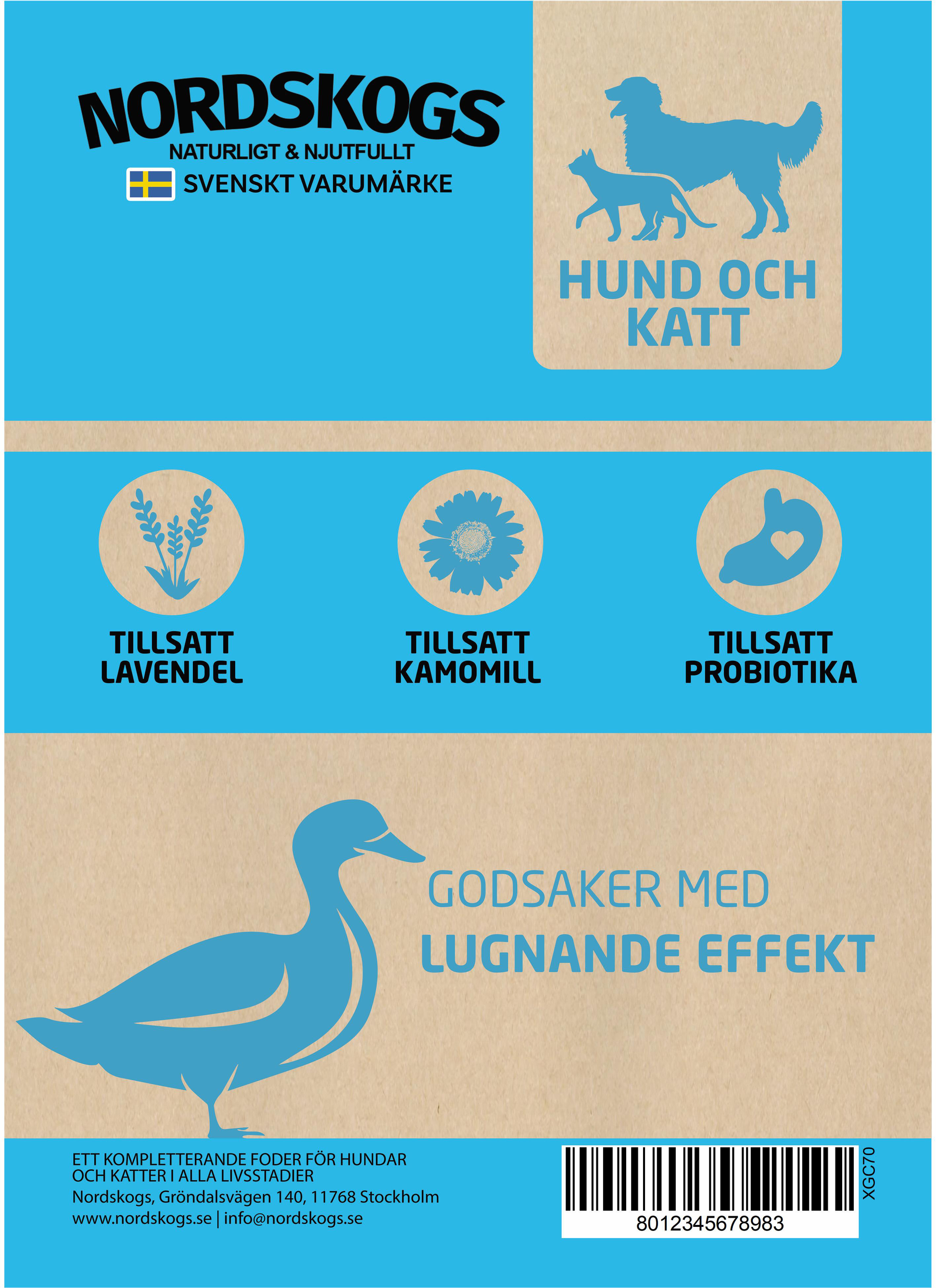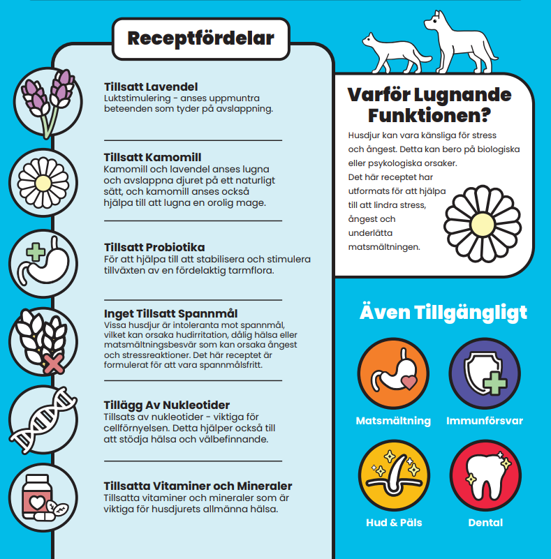 Färsk förberedd anka 40%, färsk förberedd kyckling 24%, sötpotatis 13%, potatis, ärtor, vegetabiliskt protein, mineraler, kycklingsås 1%, nukleotider 1%, cellulosa, Omega 3-tillskott, fruktooligosackarider (FOS), betaglukaner, mannanoligosackarider (MOS), kamomill (50 mg/kg), lavendel (50 mg/kg).